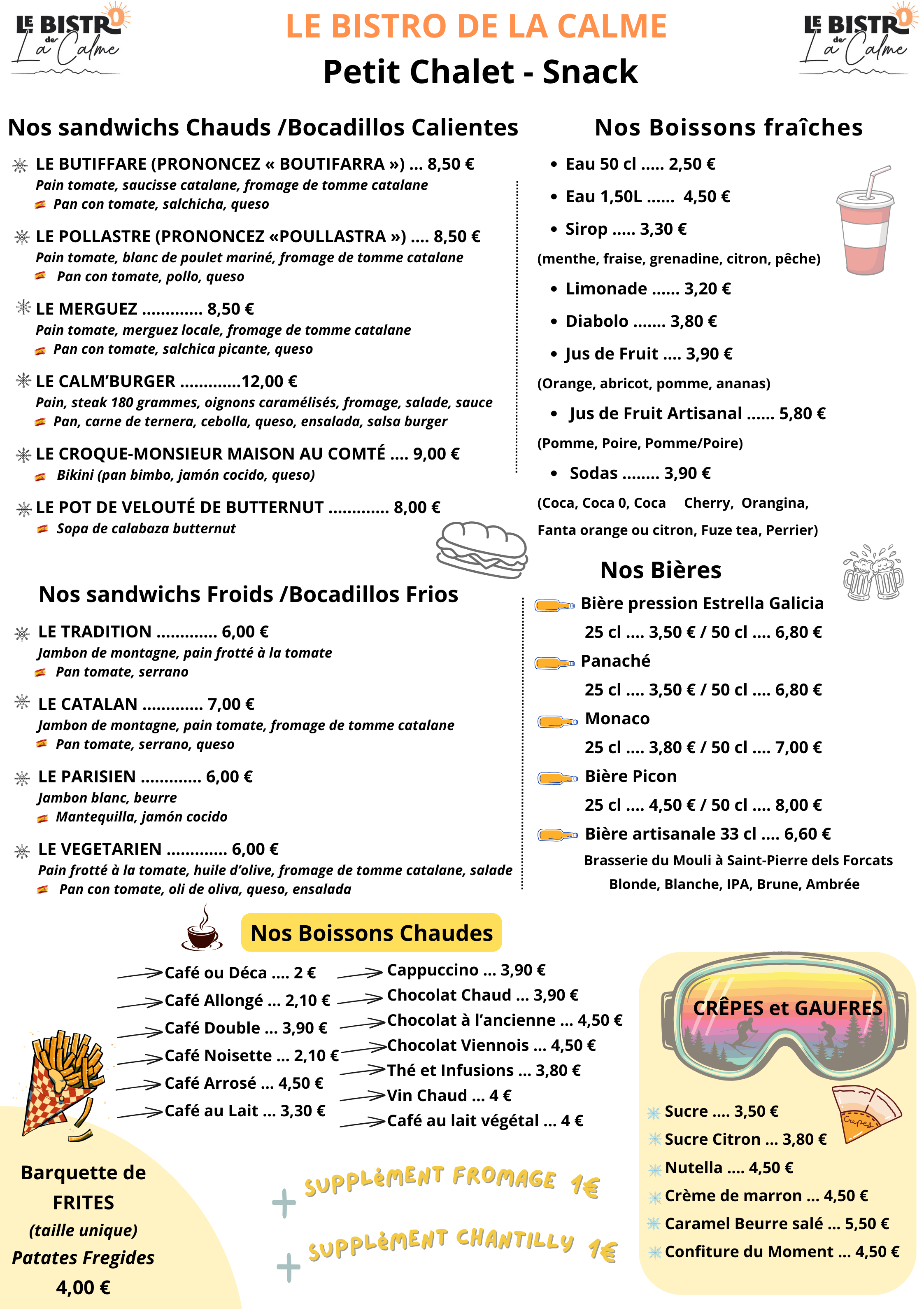 Le Bistro de la Calme est votre refuge en altitude. Quel que soit votre rythme, nous avons la formule idéale : que vous souhaitiez vous attabler confortablement pour un repas complet (service à table sur la terrasse ou dans notre salle), vous détendre sur un transat avec un snack rapide, ou simplement faire une pause bar pour un vin chaud, un café ou une crêpe gourmande… nos espaces sont conçus pour s’adapter à toutes les heures et à toutes les faims de la journée.